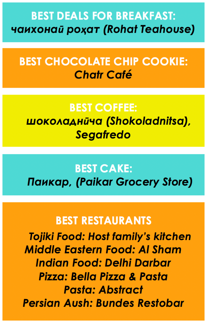 There is a lot of linguistic variety in Tajikistan, with people speaking Tojiki (Persian), Uzbeki, Shughni, Russian, and more. It’s important to keep this in mind when interacting with your host family. If you have trouble understanding what members of your host family say to each other, don’t assume it’s because your Persian needs work-they could be speaking a completely different language!
