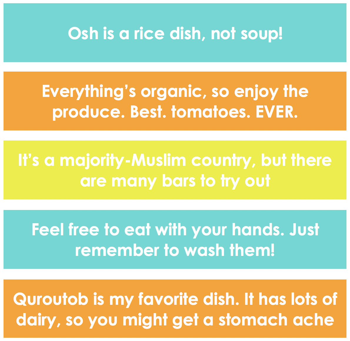 The average Tojik diet is meat and starch based, similar to Russian cuisine. Your host family may welcome you with the national dish of Tojikiston: Osh Palao. Osh is a dish traditionally made for guests and is cooked almost identically to Afghan Qabli Palao: rice is colored with browned sugar, steamed over chunks of goat or lamb, and is topped with raisins and carrots. Vegetarian options are slim but they exist. I ate a boiled egg, toast and yogurt for breakfast every day and had lots of soup and cauliflower for dinner.